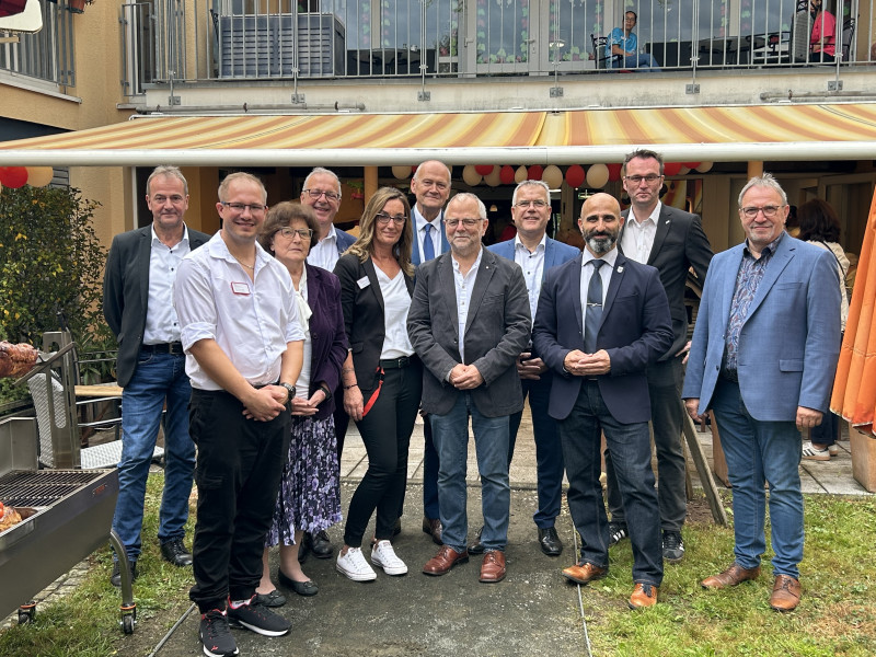 Danach begrüßte Einrichtungsleiterin Alexandra Sartorio die Anwesenden beim Sektempfang und bedankte sich in ihrer Ansprache für die Unterstützung aus Gemeinde, Kirche, Politik und vom Förderverein. Grußworte sprachen unter anderem Michael Groß, Geschäftsführer der cts Altenhilfe GmbH, Bürgermeister Thomas Wolf (Gemeinde Schönenberg-Kübelberg), Jörg Schulze (Vorstand Förderverein), Christoph Lothschütz (Verbandsbürgermeister) sowie Joachim Speicher als Vertreter des Sozialministeriums in Mainz – er überbrachte die Grüße des Staatssekretärs. Auch der noch amtierende Otto Rubly und der neu gewählte Landrat Johannes Huber nahmen an den Feierlichkeiten teil.